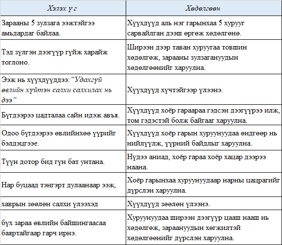 Энэхүү үгэн наадамд ээж зараа үр төлөө хэрхэн хайрлаж хамгаалж байгааг харуулна. Багш Та хүүхдүүдтэйгээ туршаад үзээрэй. Эхний үед багш үгийг нь хэлээд, хүүхдүүд хөдөлгөөнийг хийх бөгөөд яваандаа хүүхдүүд үгээ өөрсдөө нэгэн зэрэг хэлж, тохирох хөдөлгөөнийг гүйцэтгэнэ.