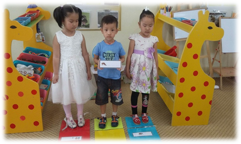 - 3 өөр өнгө бүхий дөрвөлжнүүдээс бүрдсэн урт нарийхан дэвсгэр бэлтгэнэ. Дэвсгэр тус бүр дээр зурган бүдүүвч бүхий картууд байрлуулсан байна.
