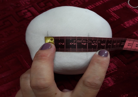 2. Зураасны дагуу тойруулан хайчилна. Дараагаар нь хайчилж авсан 2 давхар дугуй даавууныхаа ирмэгийг тойргоос дотогш 0,5 см-ын зайтайгаар нийлүүлж оёно. Оёхын өмнө тойрог дээрээ 5 см-ын зайтай хэмжээд, 2 талд нь босоо зураасаар тэмдэглэнэ. Энэ хэсгийг оёхгүй үлдээж, ам гаргана.