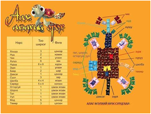 Мэлхийний нурууг хааш хааш 6 үелсэн бүгд 36 шагайгаар бүрдүүлж өрнө. Нурууны дөрвөн үзүүрт тус бүр 4 шагайнаас бүрдэх 4 шилбэ буюу нийт 16 шагайг өрнө. Шилбэний доод талд дөрвөн тавхай тус бүрт 5 буюу нийт 20 шагай өрнө. Нурууны дээд талд нь хүзүү болгож 6 шагайг хоёр эгнээгээр өрнө. Хүзүүний дээд талд нь толгой болгож 3 шагайг өрөөд хоёр талд нь нүд 2, чих 2 болгож өрнө. Нурууны доод талд нь сүүл болгож гурван шагай өрнө. Нурууны 36 шагайн дээр давхардуулж бөөрний хоёр, зүрх ба давсгийн нэг нэг шагайг зохих журмын дагуу байрлуулан өрнө. Бөөр, зүрх, давсгийг тод өнгийн шагайгаар төлөөлүүлнэ.